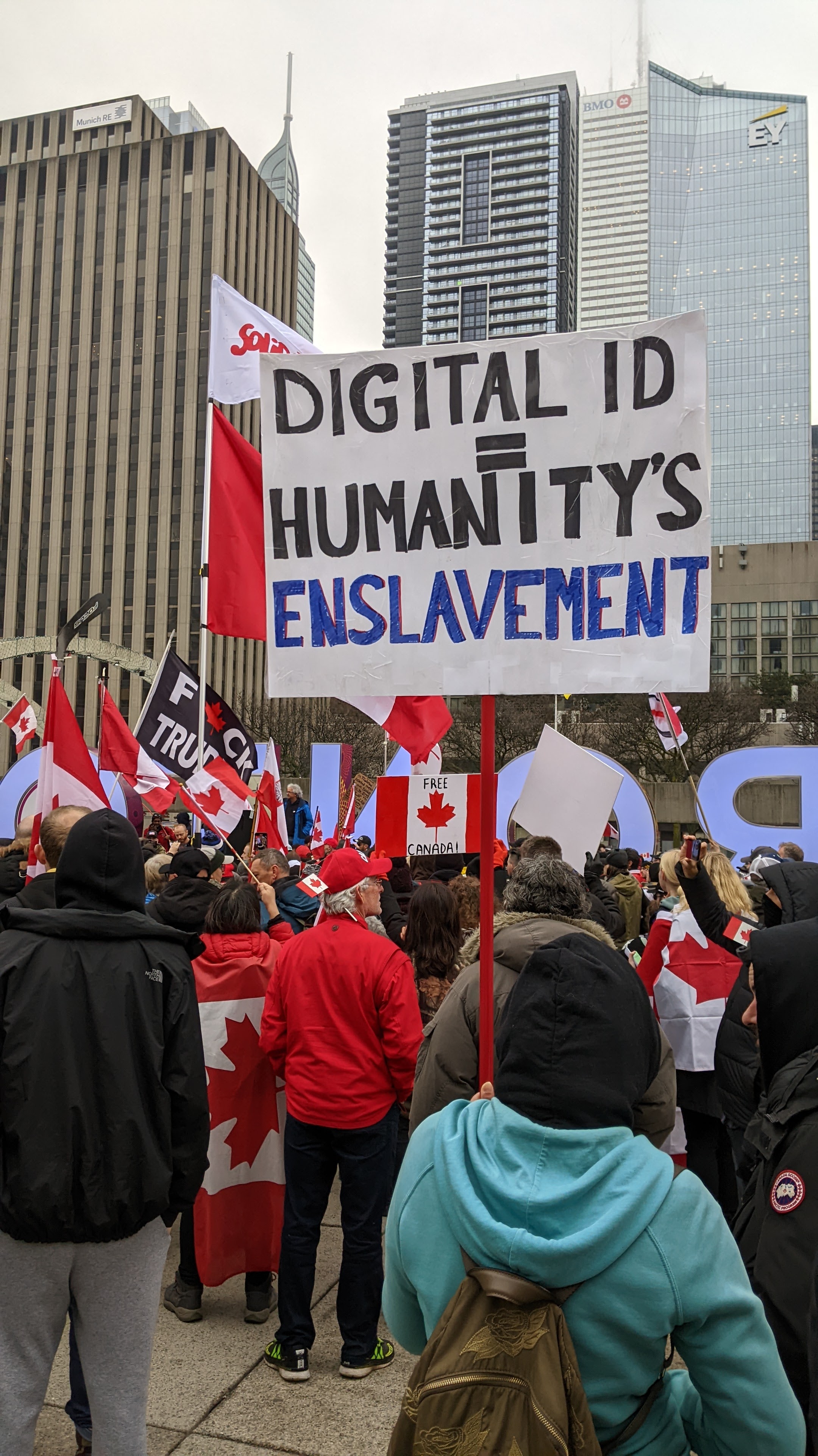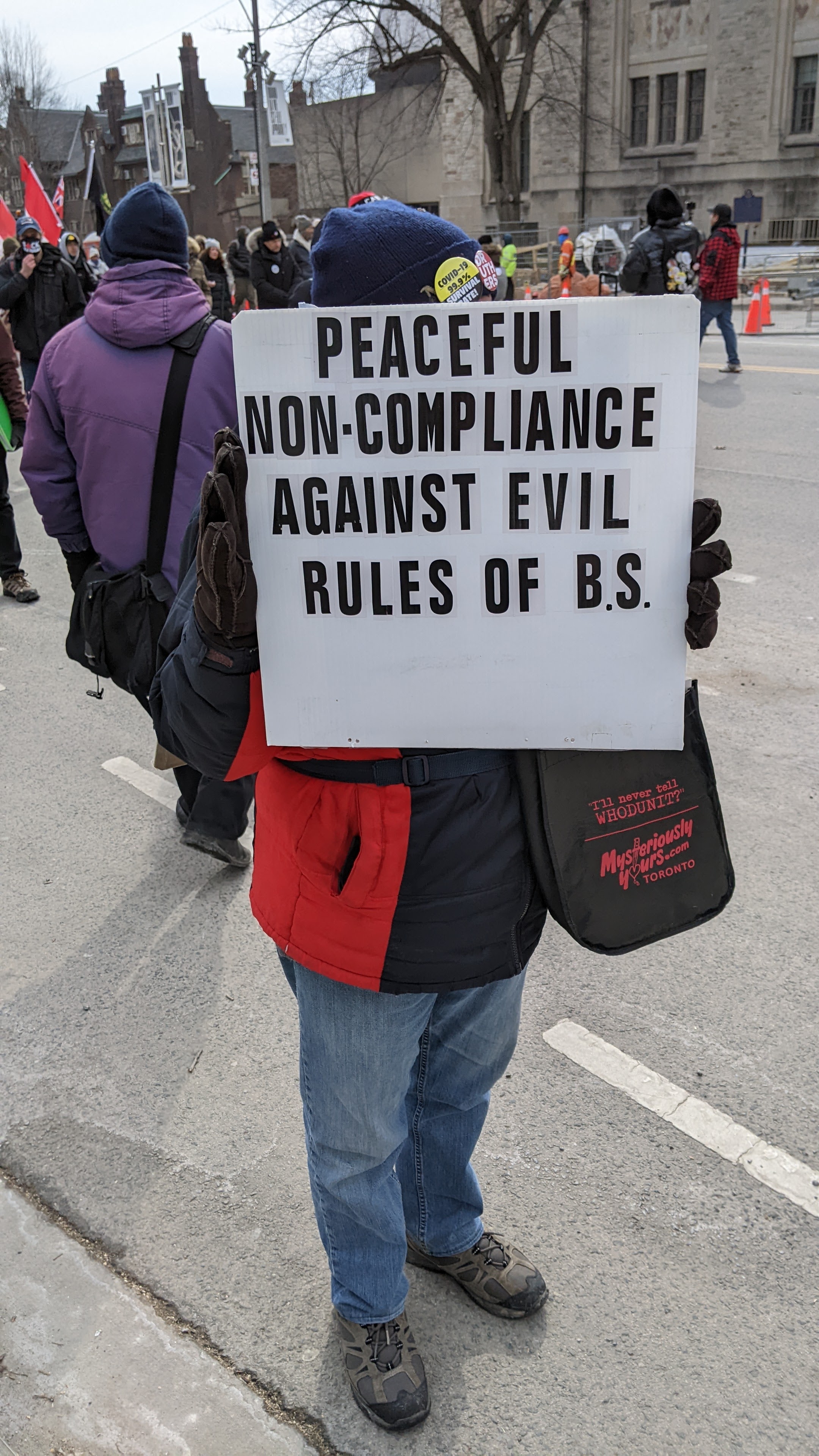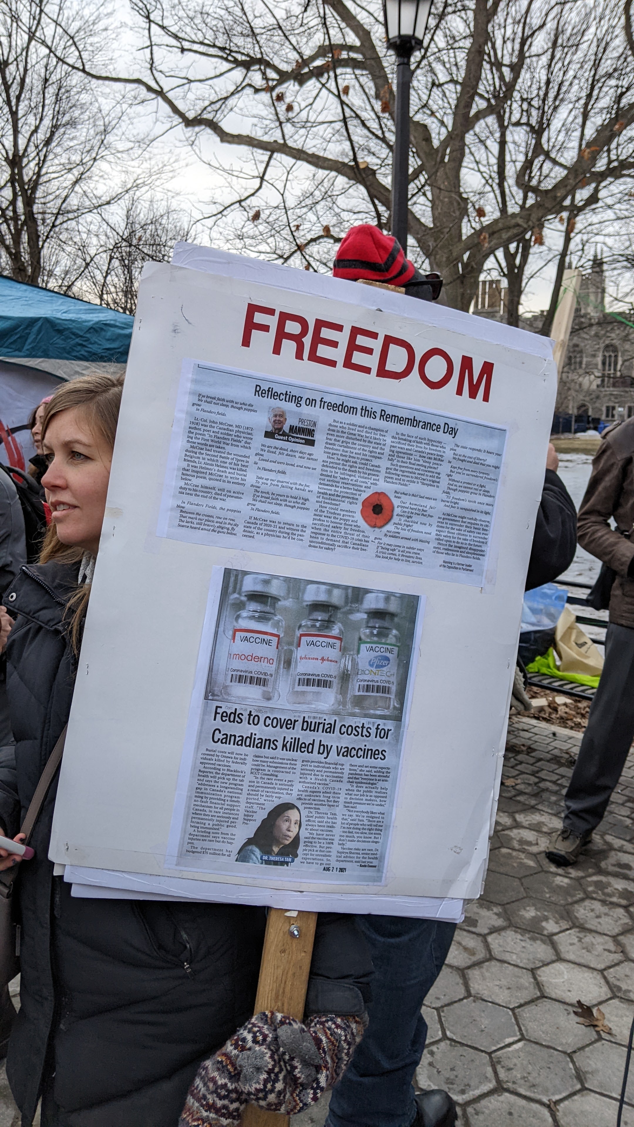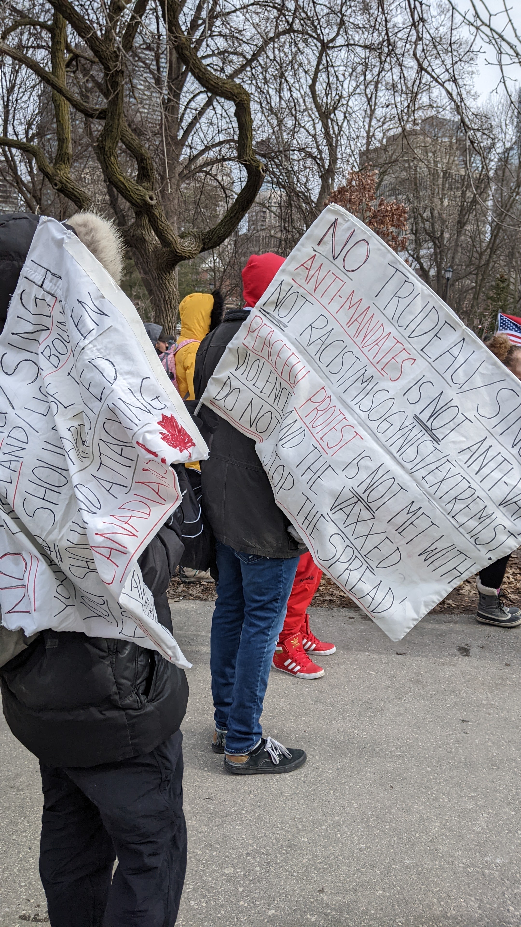Pictured are signs people brought to Nathan Phillips Square in Toronto for a Canadian patriot/trucker protest against Covid-19 restrictions and mandates. This post is one in a series documenting the movement’s political expression.