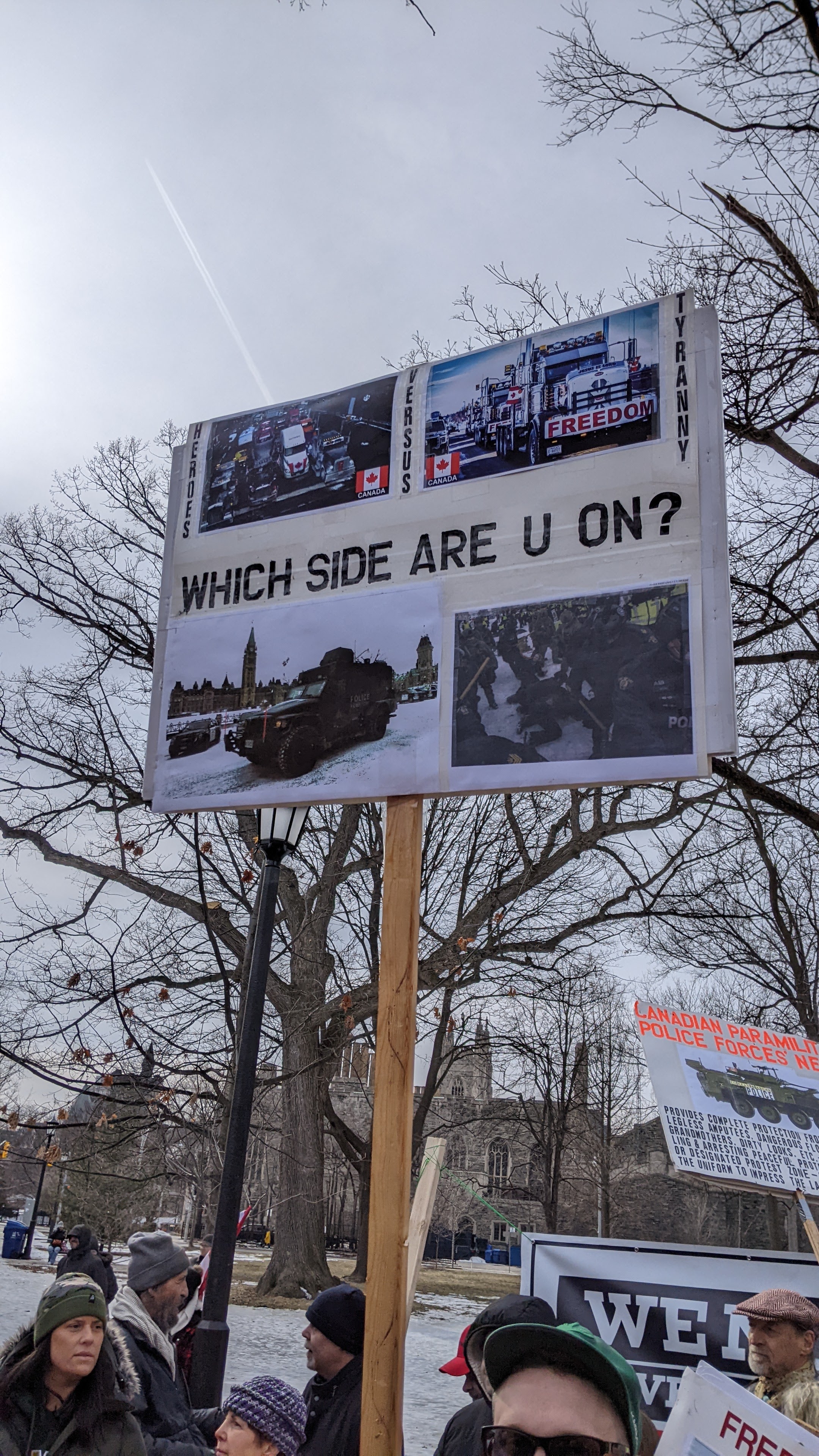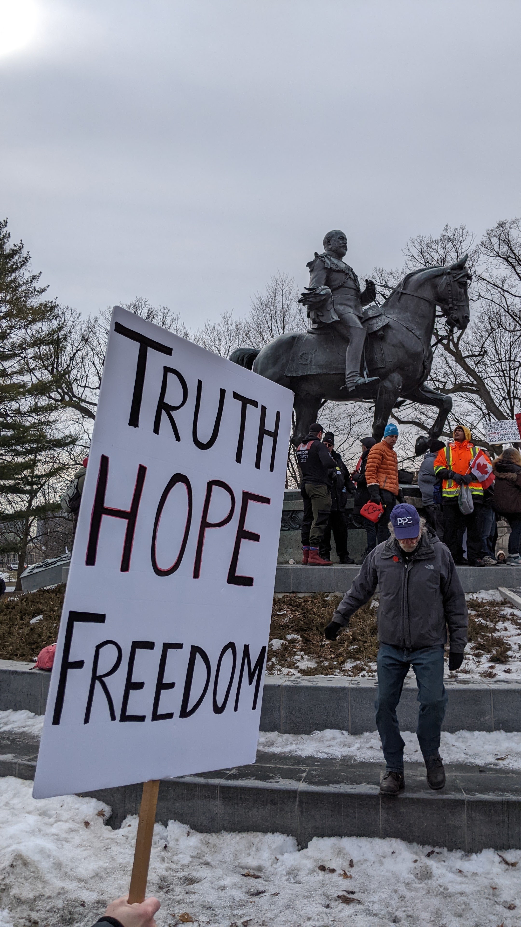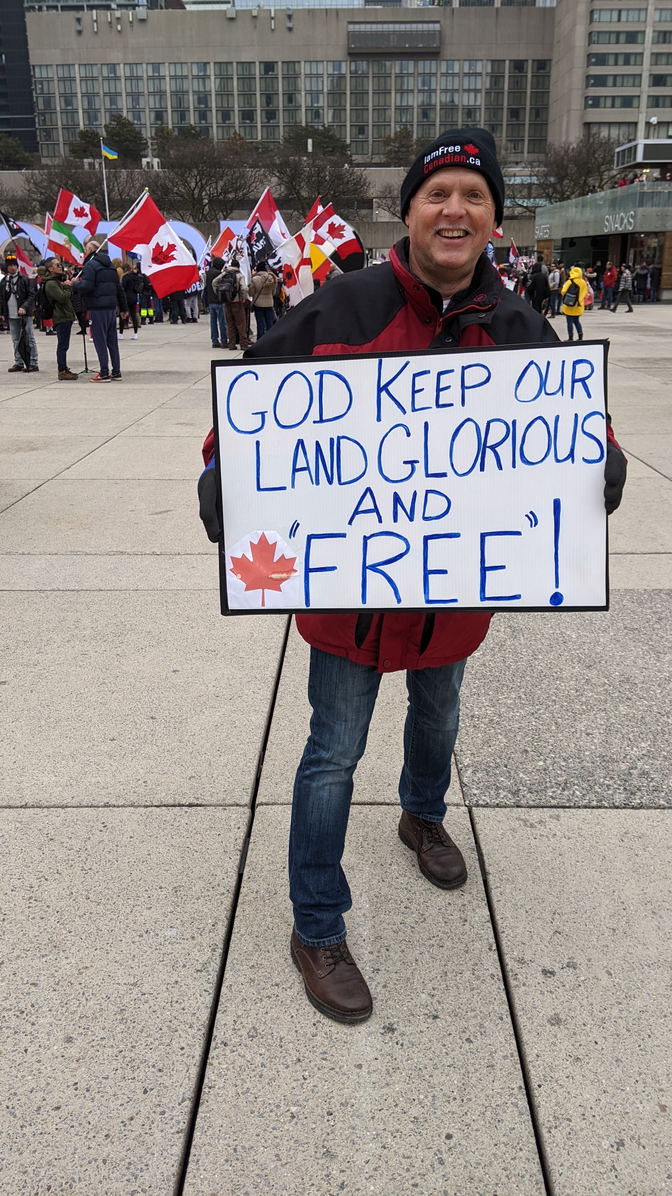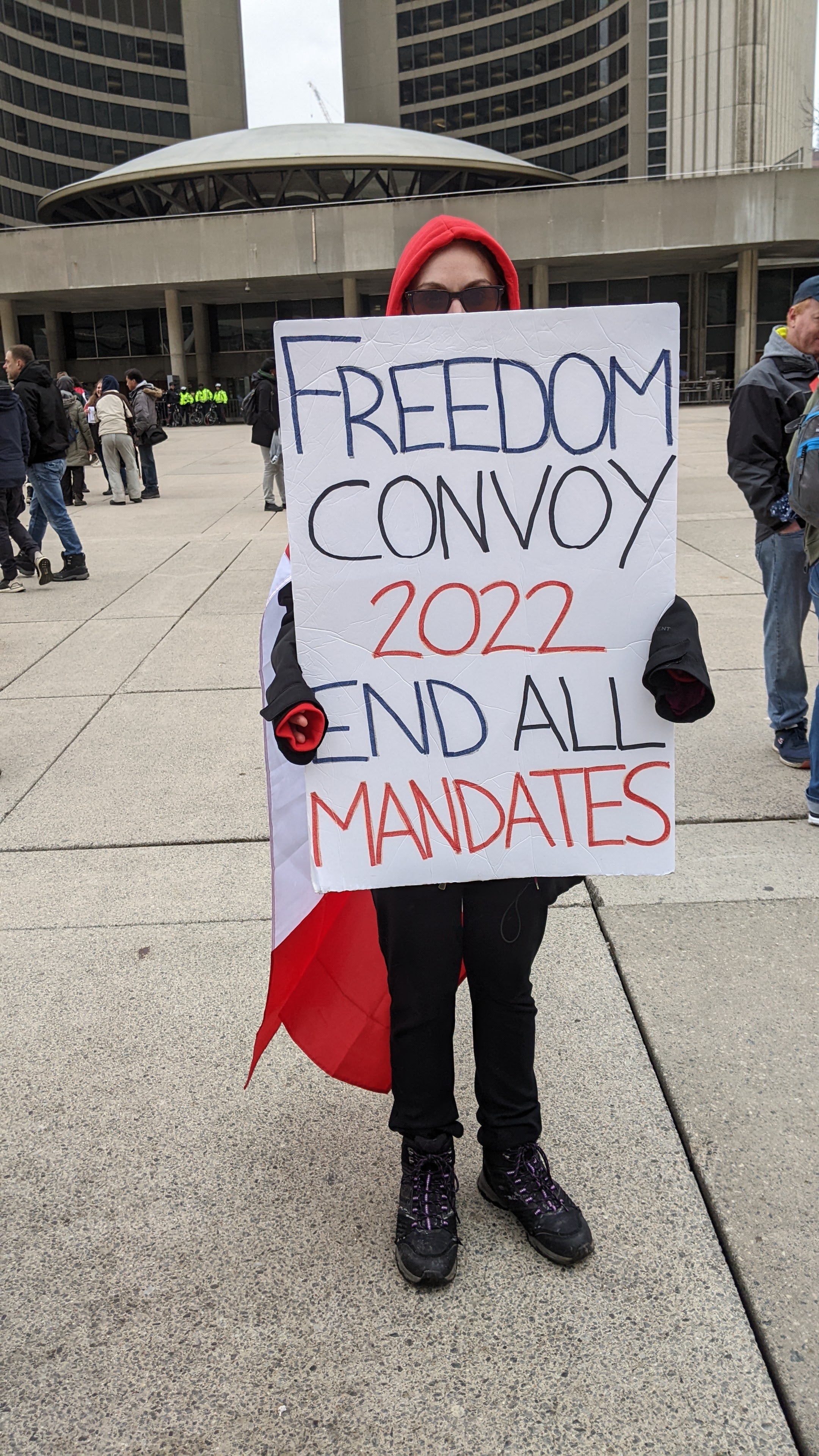 Pictured are signs people brought to Nathan Phillips Square in Toronto for a Canadian patriot/trucker protest against Covid-19 restrictions and mandates. This post is one in a series documenting the movement’s political expression.
